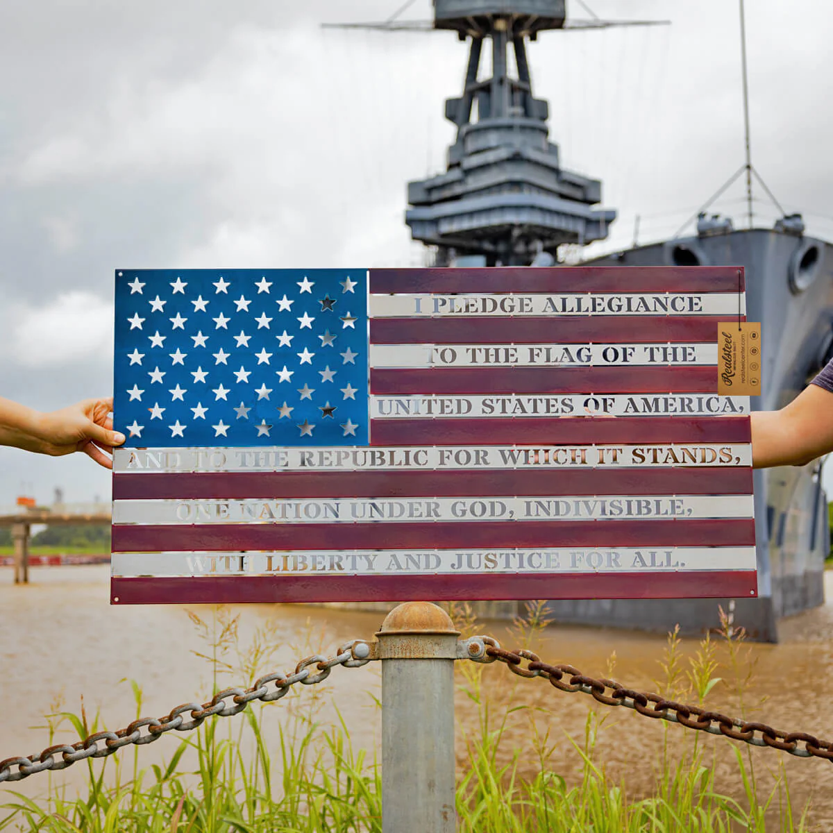 Handcrafted with pride in Texas, our American Flag - Pledge of Allegiance artwork is a stunning piece of custom art made to withstand years of indoor/outdoor use thanks to our weather resistant baked on powder coating.